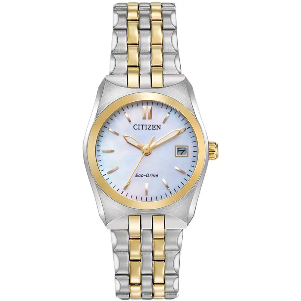 A fresh addition to your watch collection, discover this ladies' Bracelet from Citizen is styled in a two-tone case and bracelet with an elegant Mother-of-Pearl dial. Date window at 3 o'clock and Eco-Drive technology, powered by light, any light. Never needs a battery.