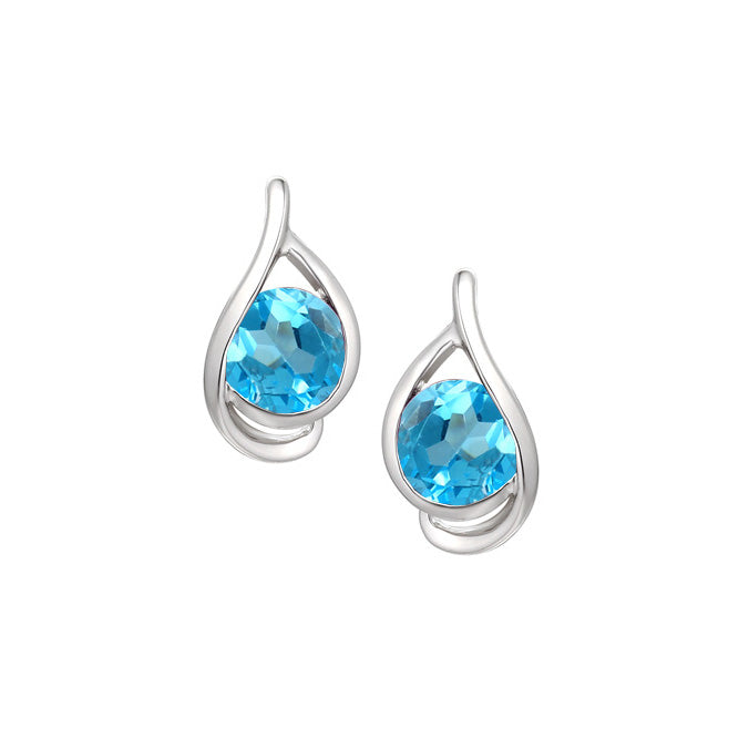 This lively pair of silver stud earrings each feature a vibrant round cut blue topaz set in a silver swirl design.